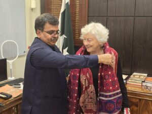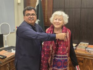 Dr. Valeria Piacentini Fiorani, a professor of history and institutions of the Islamic world at the Faculty of Political Sciences, Catholic University, Milan, Italy, visited the Sindh Archives. She received a warm welcome from the Director of Archives – S.M. Mehdi Shah, Director provided her with detailed information about the history of the Sindh Archives and the procedure for preserving the archival records maintained by the archives department. Dr. Fiorani expressed her gratitude at seeing how the records are being preserved, as well as the methods of conservation and digitization being employed. At the conclusion on her visit, Director S.M. Mehdi Shah presented Dr. Fiorani with a traditional Sindhi ajrak and a publication from the Sindh Archives as a token of gift. (Watch Videoclip) Sindh Archives Official YouTube Page.